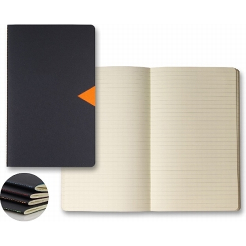 Make your next marketing campaign a success when you offer this Ivory Notch Journal! It measures 5 1/4" x 8 3/8" and comes with 80 ivory sheets of FSC certified paper with gray lines. It's also equipped with a black die-cut cover showing a colored end-page through the notched area and a matching saddle stitching on the spine. Add an imprinted company name or logo to the item using foil stamping and hand this out to customers who appreciate the value you bring!. Material - Paper.