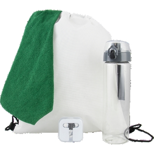 >Kit includes: DSBP - drawstring backpack, 1518HC - hemmed color towel, EARBUDDY - earbuds in a case, TREKSPORT25 - 25 oz bottle with trekker lid