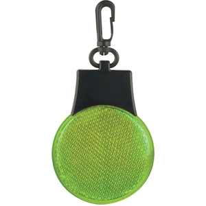 The Flashing Reflector Light features 3 LED light settings (solid blinking flashing left to right). Push the button on the back to power it on/off and to switch between settings. Includes a swivel plastic hanging clip.
