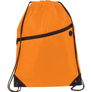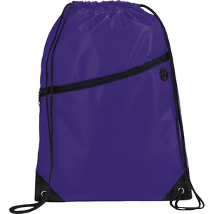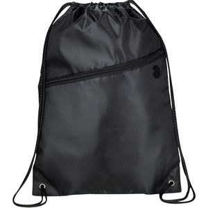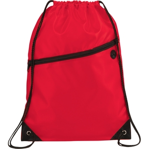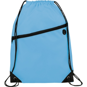 The Robin Drawstring Bag has a large main compartment with a cinching rope closure. The zippered front pocket also features an earbud port and reinforced corner tabs.