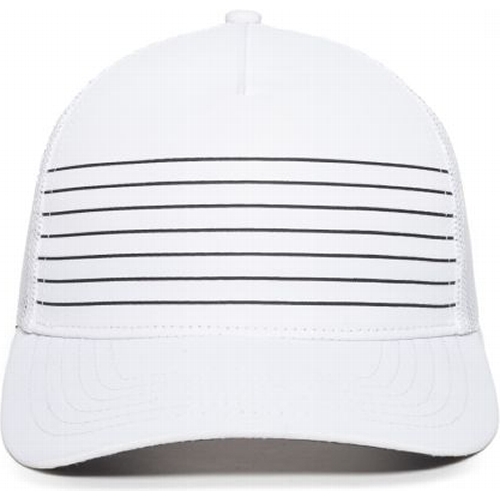 Keep your golf game on par with the OC503M and its striped, Pro Round Crown design that is great for patches. Moisture wicking polyester, mesh back panels, and a Q3 wicking sweatband are great for keeping you cool during the front and back nine.