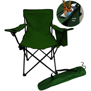 Portable camping/sport chair with a built in cooler in the arm rest. 600 denier nylon. Comes with carry case. Pop up design with sturdy aluminum frame. Comes with built in cup holder. Uses: Sporting Events,Beach,Camping,Outdoor,Sport,Tailgating.